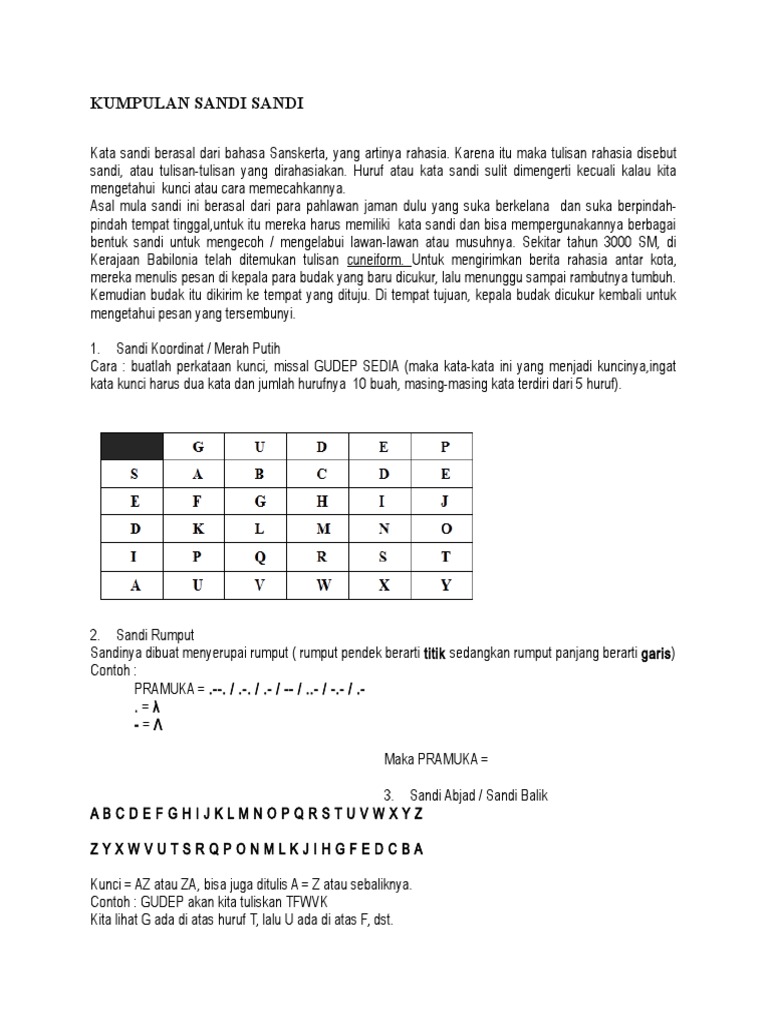 Sandi kotak pengertian contoh jenis gambar lengkap. Sandi kimia sandi kimia adalah akademi detektif indonesia. Doc soal cerdas tangkas penggalang aji pratas academia edu. Sebutkan salah satu tanaman yang dapat berkhasiat mengatasi masalah kerontokan rambut? Untuk lebih jelasnya mari kita. Rajin sandi rumput pramuka lengkap a sampai z kumpulan teks. Pramuka smantika semaphore pramuka persandian bendera. Sandi morse dalam pramuka ilmusiana. Tahukah anda apa itu sandi morse? Dalam dunia pramuka, sandi morse juga kerap dipelajari sebagai salah satu bentuk keterampilan. Mengenal sandi sandi pramuka yang wajib diketahui peserta praja. Kali ini quipper.co.id akan membahas materi tentang sandi morse secara lengkap dan jelas, mulai dari pengertian, tabel, sejarah, metode, manfaat dan contoh soal. Nah untuk melengkapi pembahasan kita kali ini, simak penjelasannya di bawah ini.