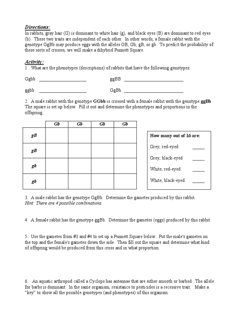 A dihybrid cross tracks two traits. In other words, a female rabbit with the genotype ggbb may produce eggs with the alleles gb, gb, gb, or gb. Dihybrid punnett square practice directions: In rabbits, gray hair (g) is dominant to white hair (g), and black eyes (b) are dominant to red eyes (b). Jul 24, 2021 · dihybrid cross punnett squares + mcat ratios shortcuttired of conflicting and confusing mcat advice?